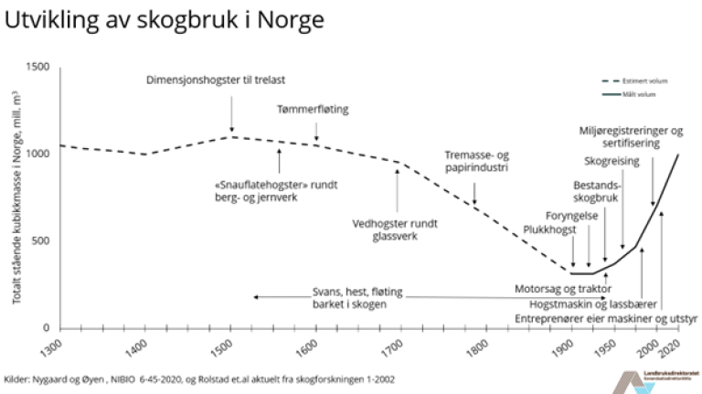 Økologisk tilstand i skog er et felles ansvar for alle sektorer som påvirker skog. Tilstanden i dagens skoger er et resultat av menneskenes aktive bruk av skogressurser, skogforvaltning og avskoging til andre arealformål over mange hundre år. Hard utnytting og utarming av ressursene i perioden 1300-1900 førte til at det var stubber etter hogst nesten over alt, svært lite død ved og få gamle store trær. Tidlig på 1900-tallet ble det oppmerksomhet på foryngelse og skogreising, og siden da er skogressursen bygd opp igjen til samme nivå som tidligere kjent.