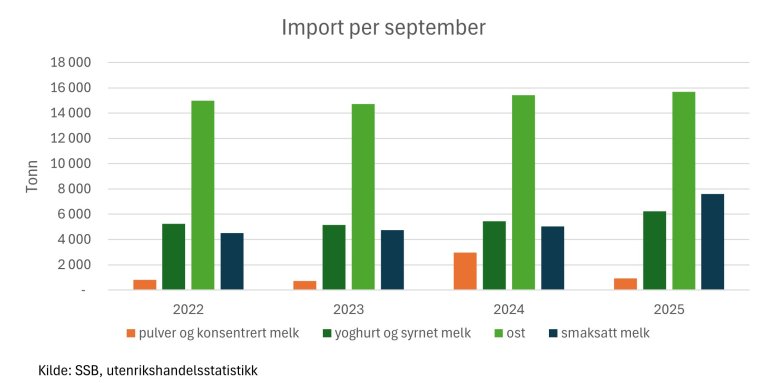Ost som er det største importproduktet i meierisektoren økte marginalt til 15 700 tonn per september 2025 fra 15 400 tonn i samme periode i fjor.