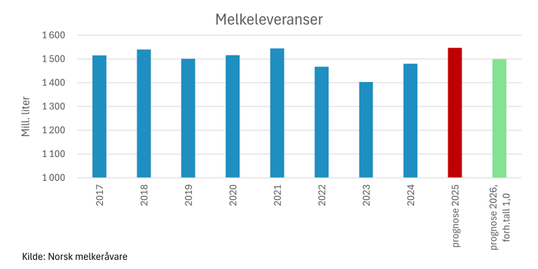 Ved tredje kvartal 2025 er det levert 1159 mill. liter melk til meieri, dette er 51 mill. liter mer enn på samme tid i fjor. Sammenlignet med tredje kvartal i 2023 ble det levert 102 mill. liter mer, tilsvarende en økning på 10 prosent. I 2025 har forholdstallet vært 1,2, noe som har lagt til rette for økningen i melkeproduksjonen hittil i år.