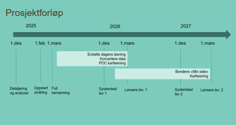 Hovedleveranse 2 er planlagt 1. mars 2027 og utvider med kartfunksjonalitet og arbeidsflate for deg som jordbruker. Finansiering for hovedleveranse 2 er forventet, men ikke sikret.